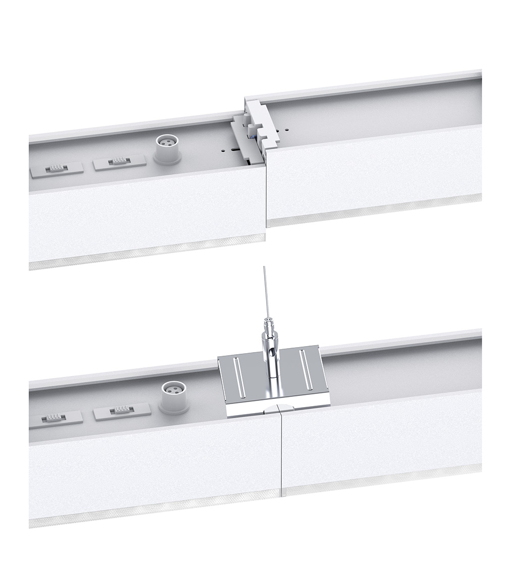 The VIVA LED Linear Channel Light with straight/triangular node connector is very simple to splice and offers maximum freed om by using different shapes of connectors: 0.6 m for greater flexibility in planning, 0.9 m for 1:1 replacements in refurbishments , and 1.2 m for cost-effective projects. Provides the optimum solution for a wide range of specification requirements and various ceiling heights in industrial production. Surface mounting and suspension mounting are available.