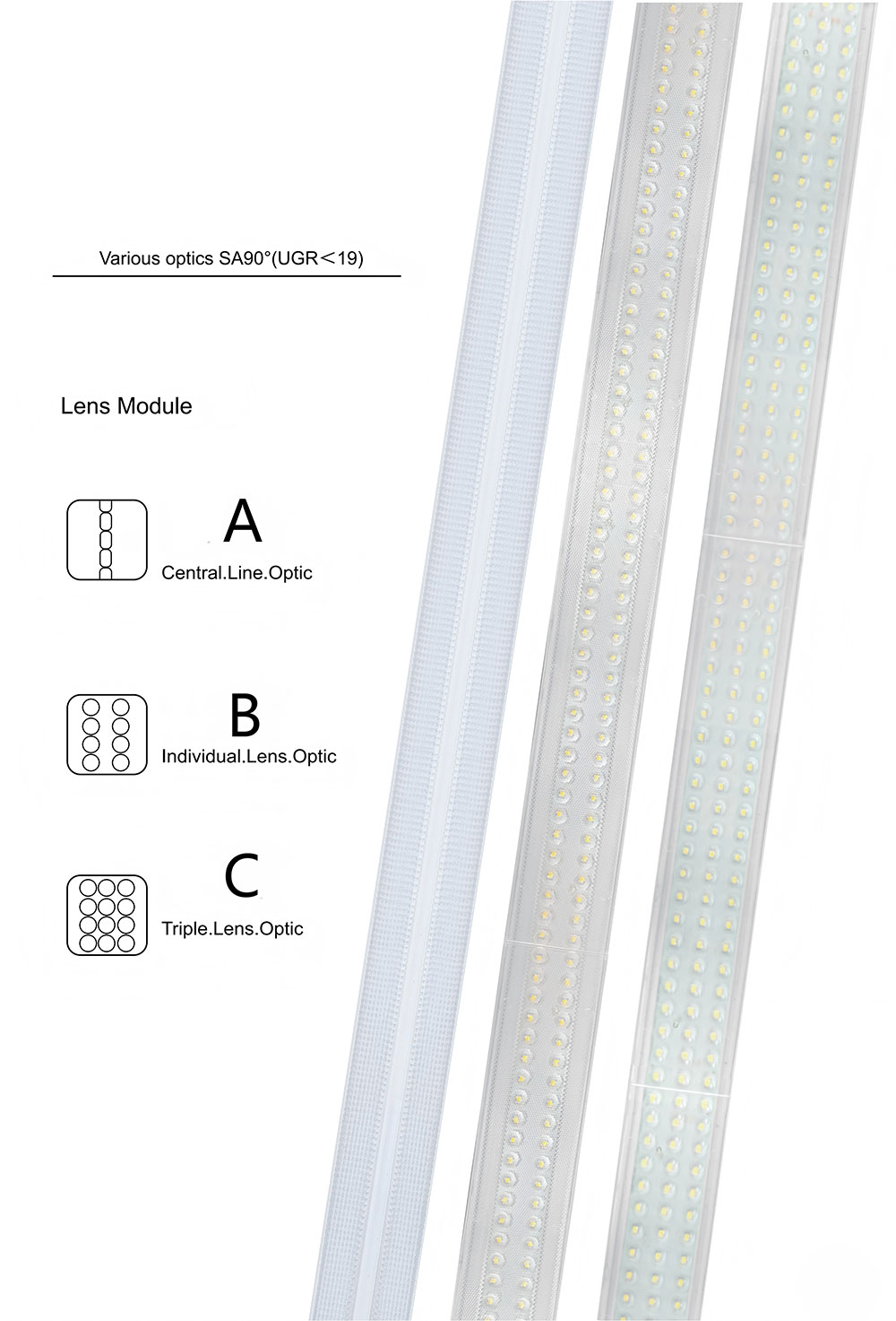 It offers three lens options—central line optic, individual lens optic, and triple lens optic. This flexibility ensures optimal illumination performance across different functional and aesthetic requirements.